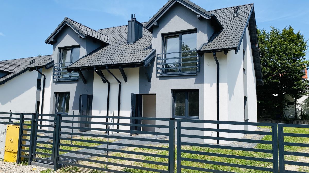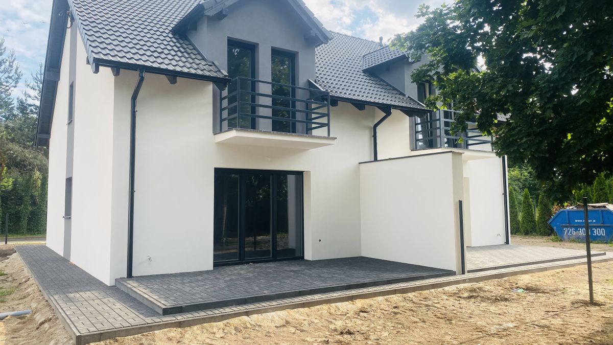 8.Okna i drzwi balkonowe z PCV trójszybowe w kolorze antracyt jednostronnie. Szyba w łazience crepi. Balkon z izolacja poziomą i obróbką blaszaną. Na balkonie zamontowane balustrady ocynkowane.