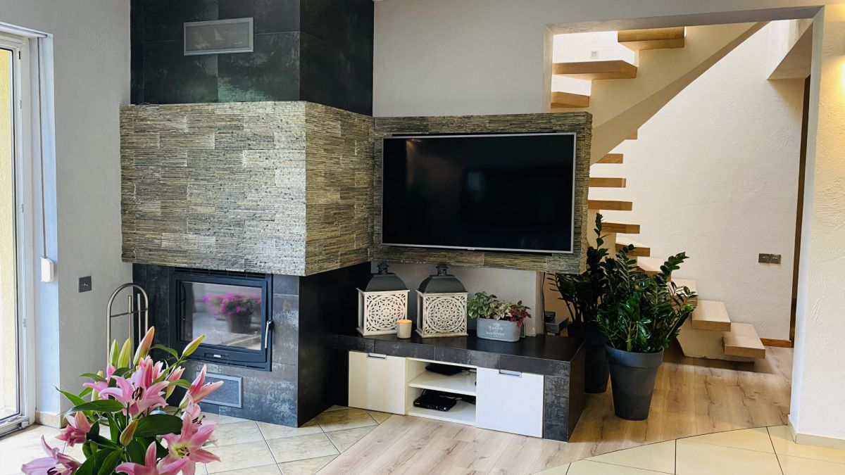 Dom ogrzewany jest piecem gazowym (grzejniki) + w salonie jest kominek opalany drewnem (z nadmuchem na piętrze). Zamontowana jest także klimatyzacja.