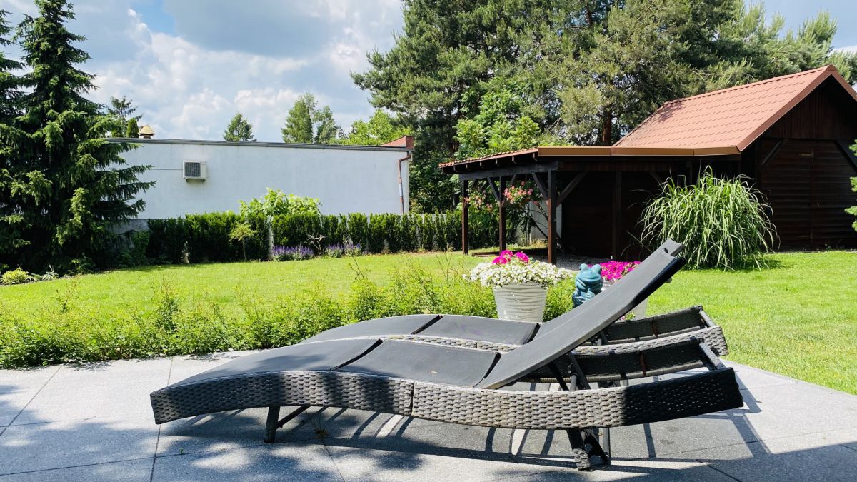 Duży zadaszony taras oraz domek ogrodowy wg indywidualnego projektu z drewutnią i dodatkowym zadaszonym miejscem do spędzania czasu np. przy grillu. Urządzony ogród z licznymi nasadzeniami z podlewaniem ogrodowym.