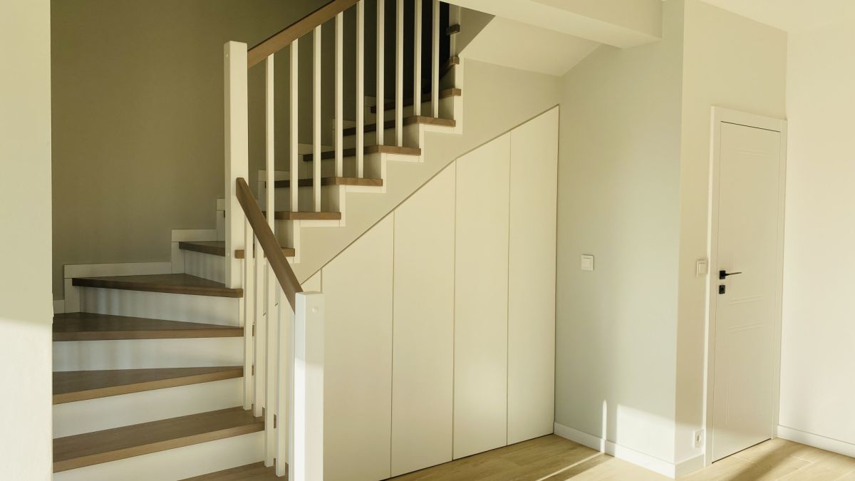 ➔Pod schodami z zabudowa przestrzeń do przechowywania z miejscem na pralkę.