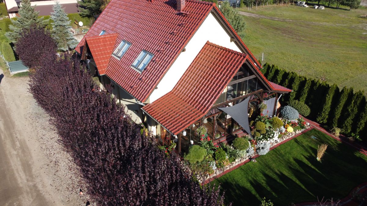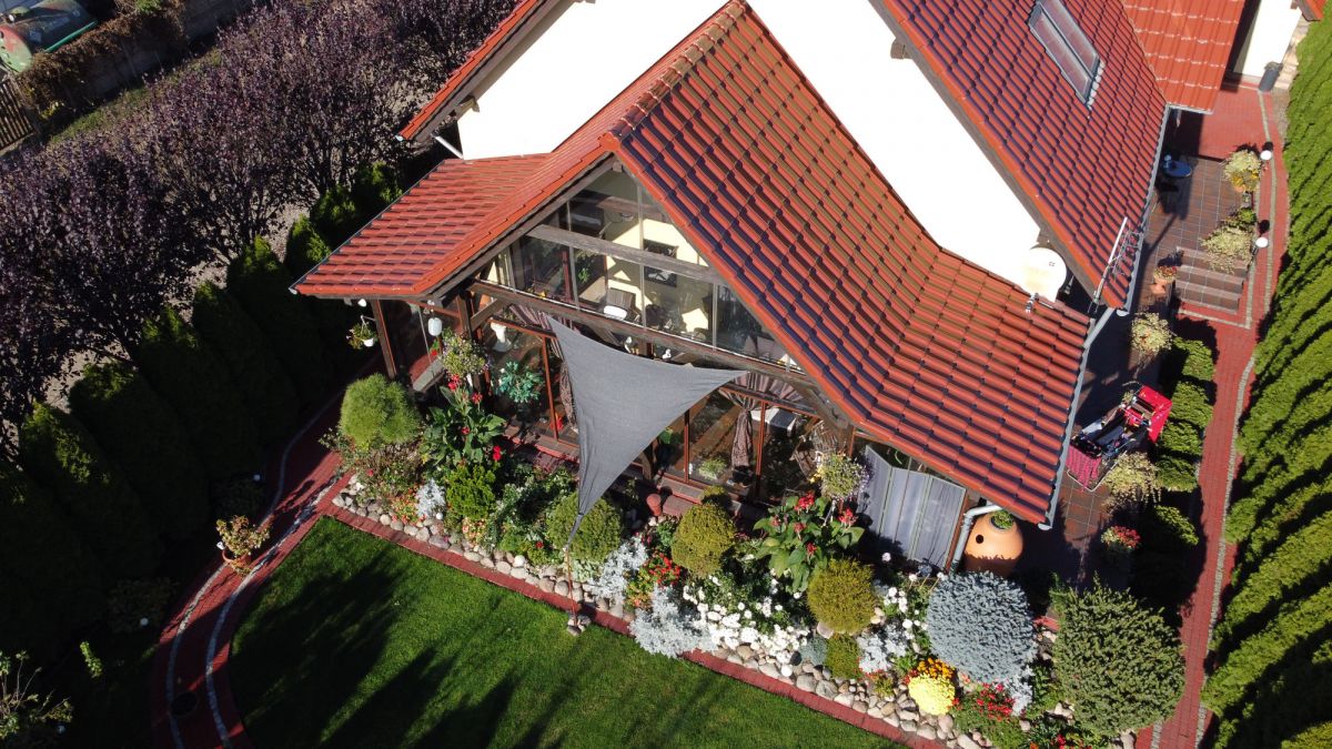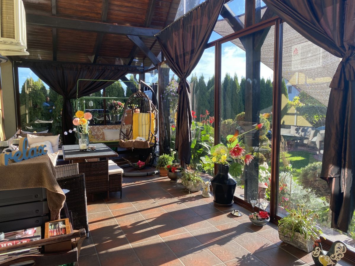 Dodatkowo poza pierwotnym projektem, dobudowano drugi garaż, dodatkowe pomieszczenie gospodarcze oraz ogród zimowy od strony salonu.