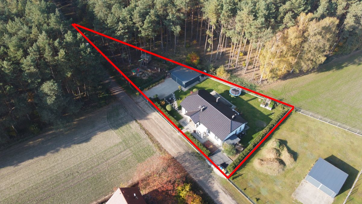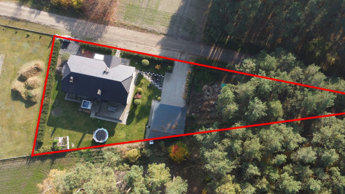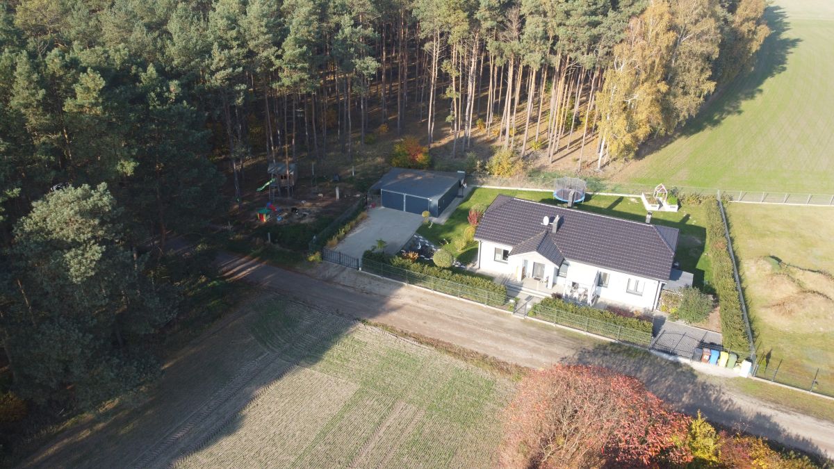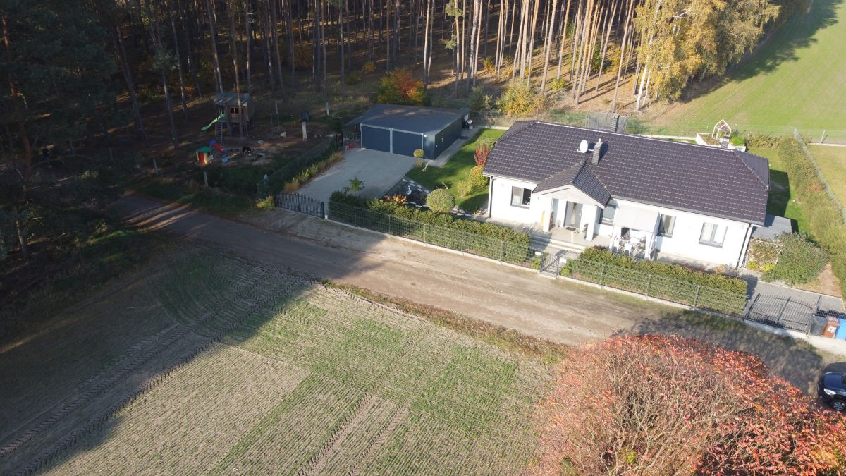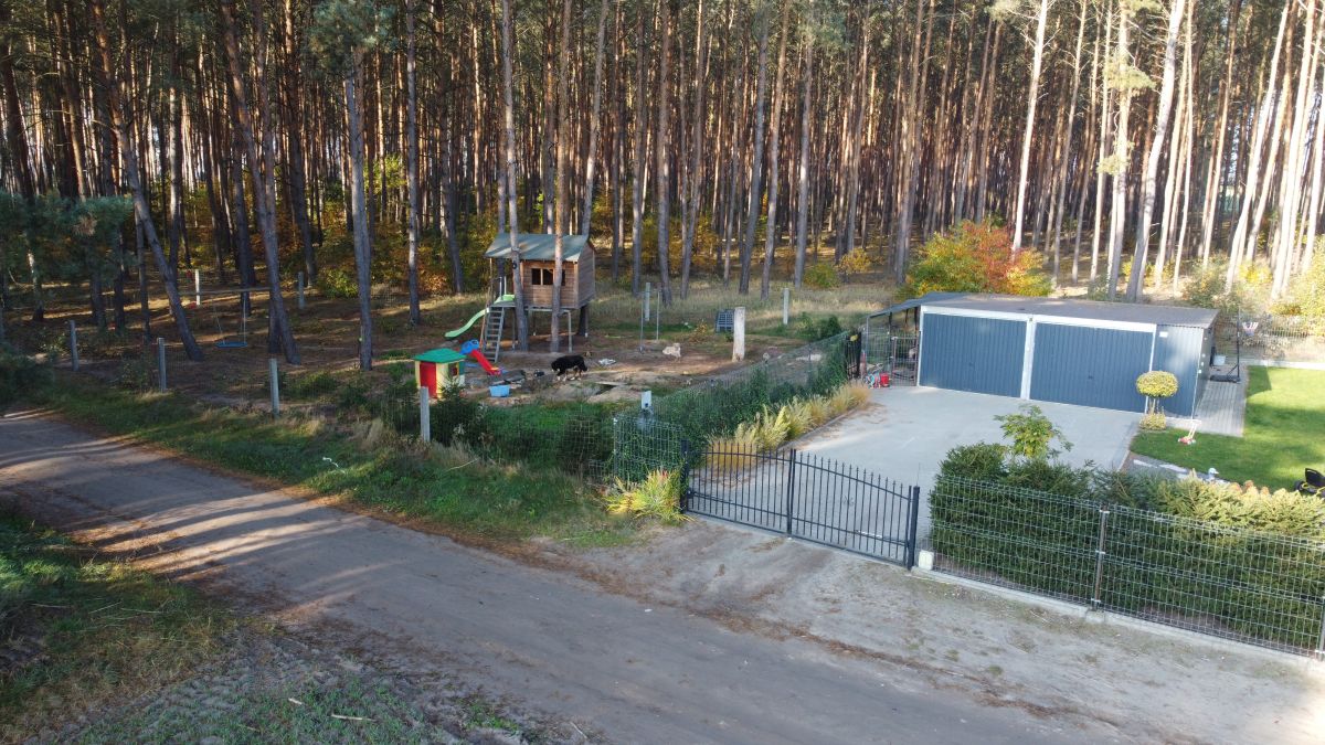 Działka w połowie zalesiona. Oprócz domu znajduje się na niej garaż dwustanowiskowy o powierzchni 50 m2 z automatycznymi bramami,