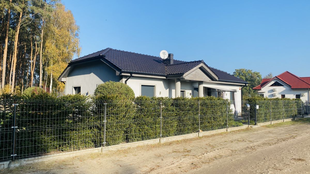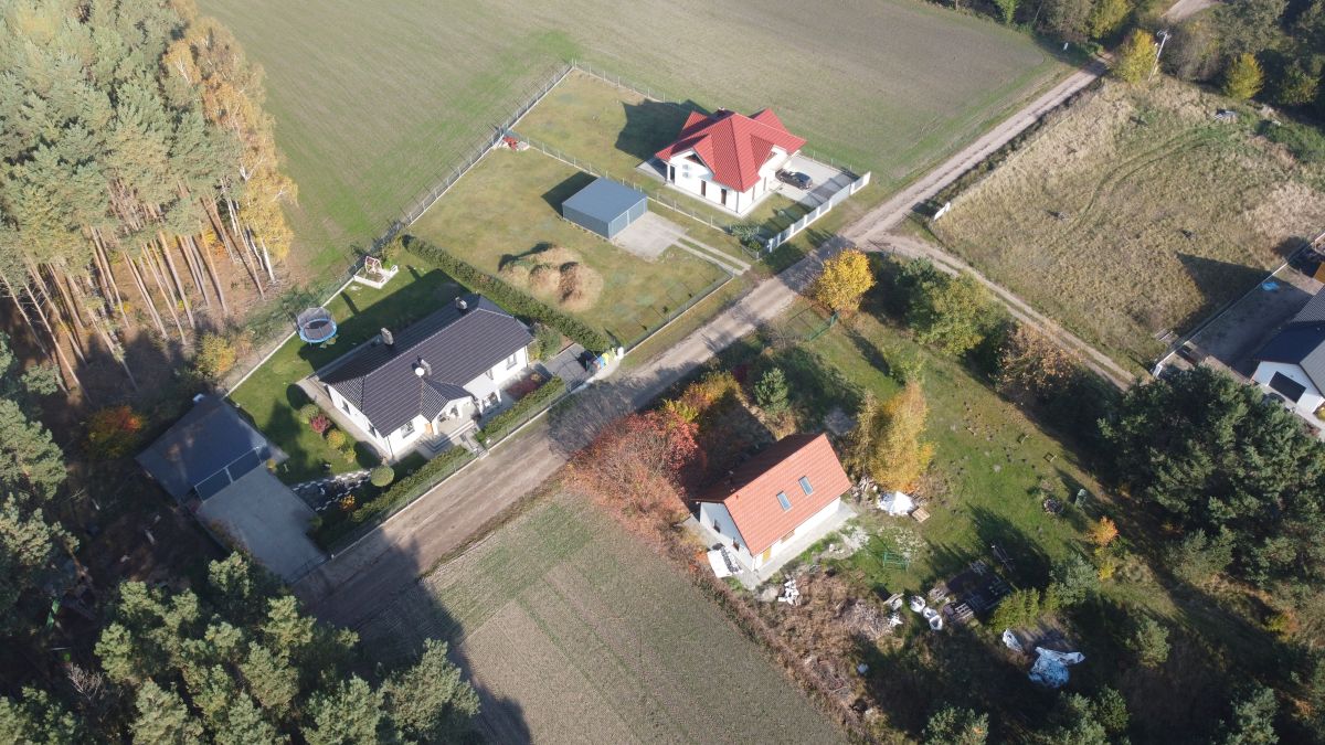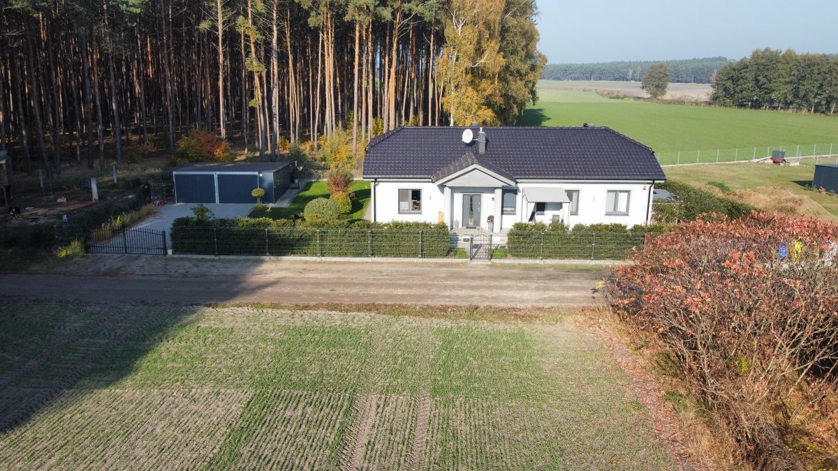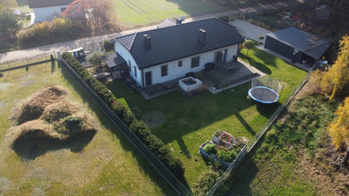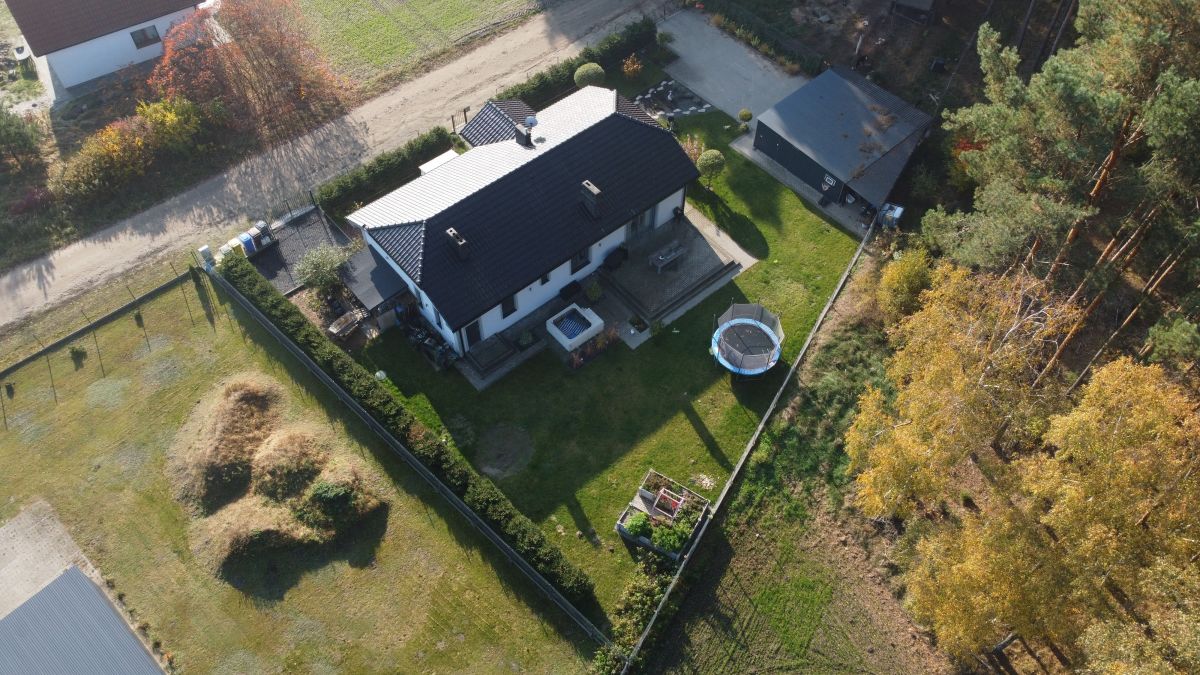 Działka w połowie zalesiona. Oprócz domu znajduje się na niej garaż dwustanowiskowy o powierzchni 50 m2 z automatycznymi bramami,