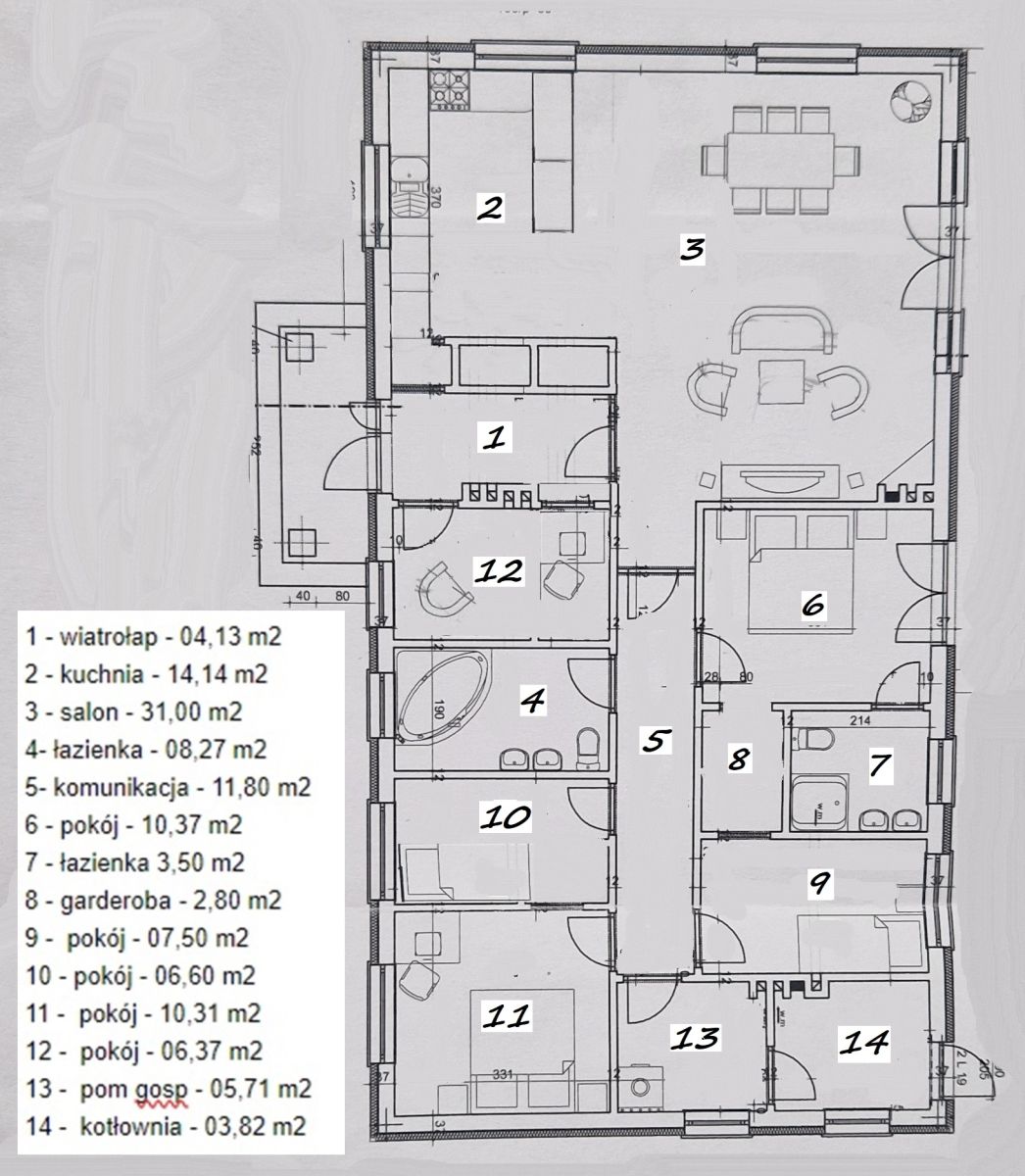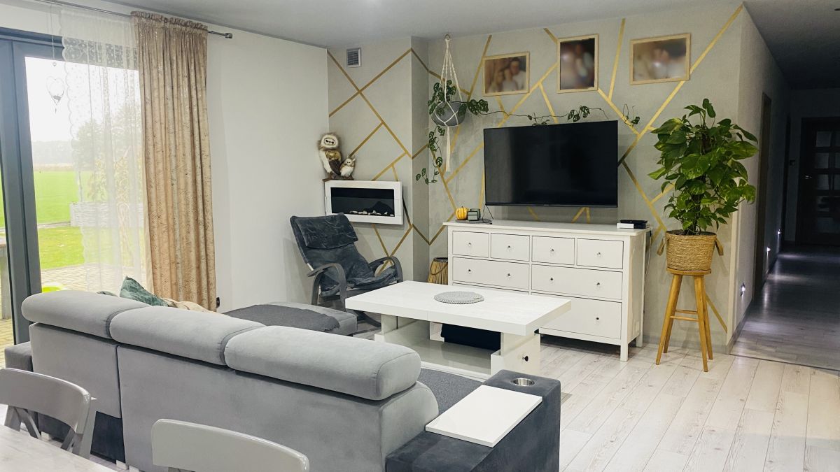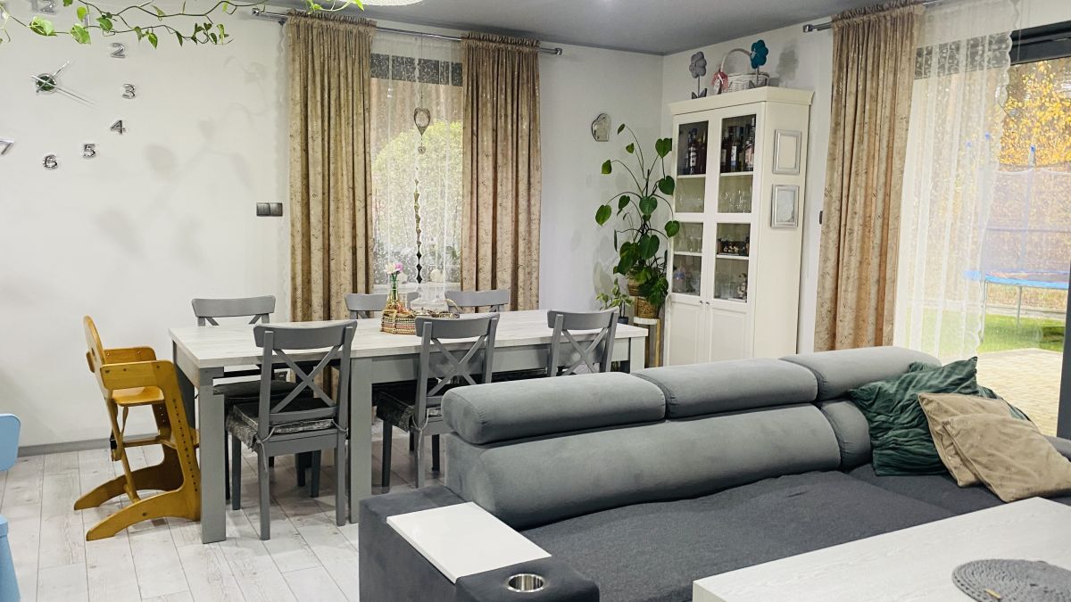 Dom o powierzchni całkowitej 125,69 m2 posadowiony jest na działce wielkości 1564 m2, składa się z sześciu pokoi, gdzie aż pięć może być przeznaczone na sypialnie, dwie łazienki, salon + aneks kuchenny, pomieszczenie gospodarcze + kotłownia.