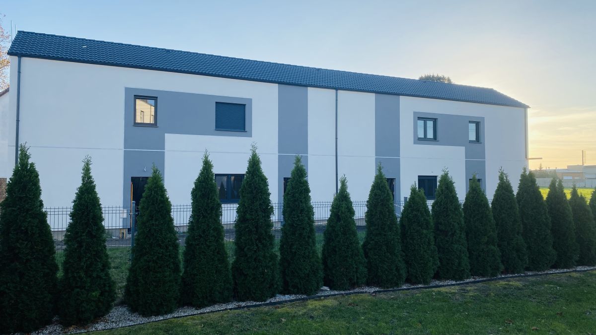 Ściany budynku z porotermu 18 cm ocieplone styropianem 15 cm , tynk zewnętrzny akrylowy