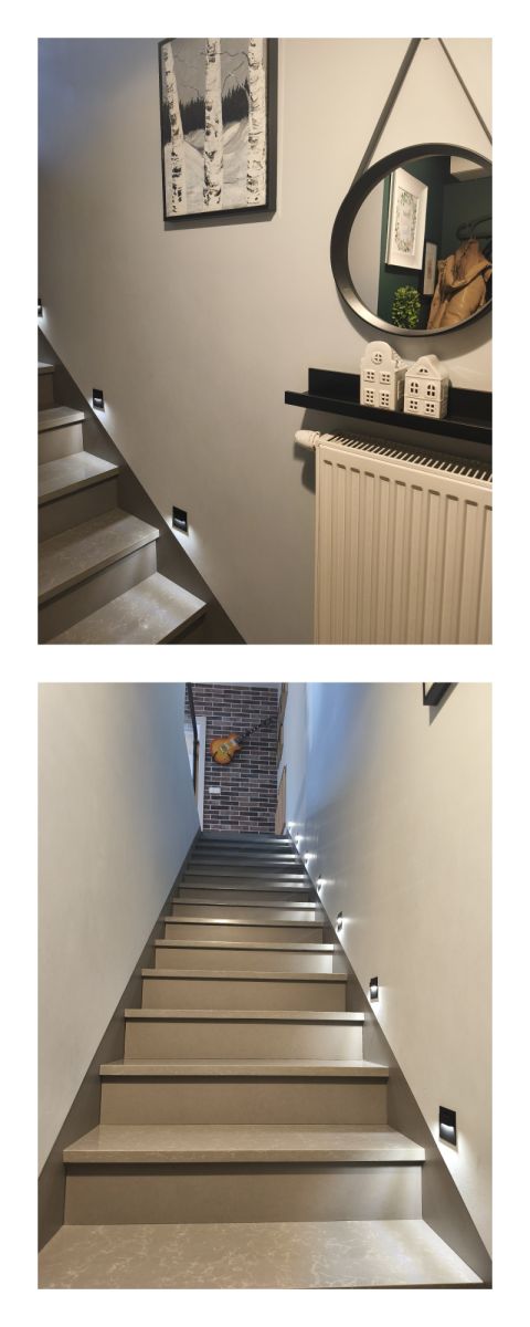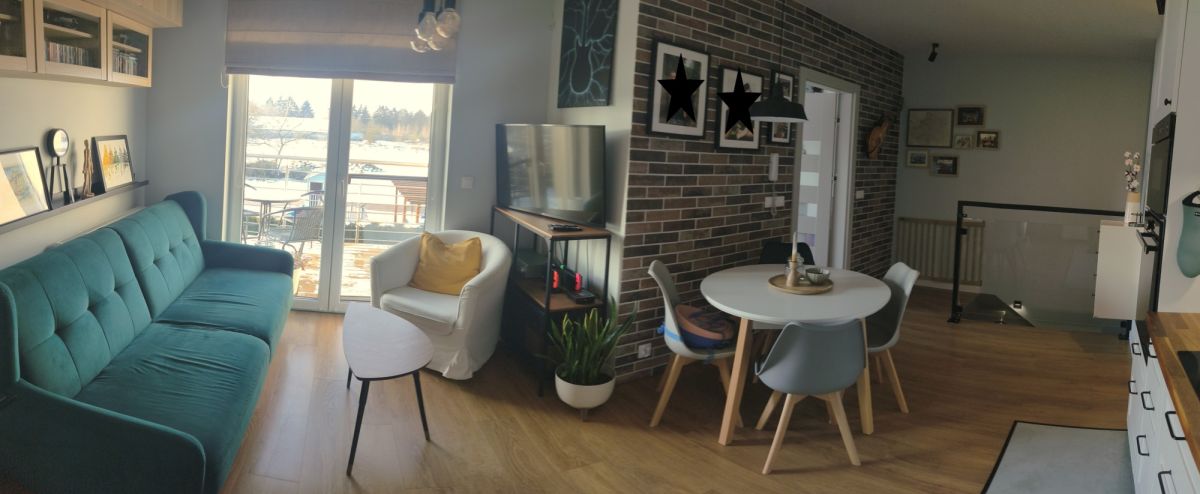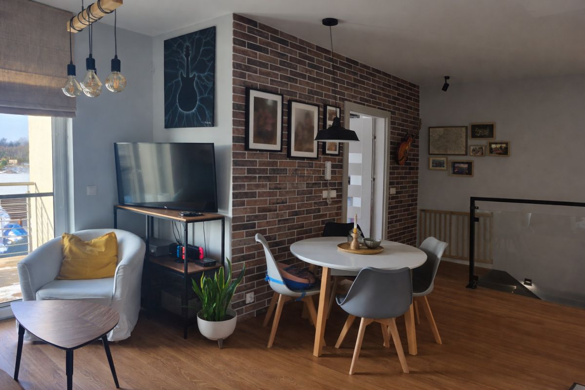 Na parterze jest znajduje się część wspólna z wejściem do dwóch mieszkań, następnie korytarz i schody prowadzące na piętro. Na jednym poziomie jest zlokalizowany salon z aneksem kuchennym i dwie sypialnie oraz balkon od południa dzięki czemu mieszkanie jest dobrze doświetlone.