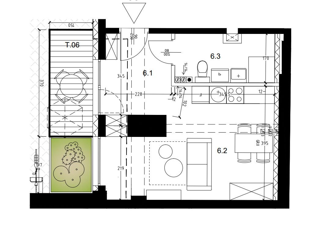 ◦ aneks kuchenny - 5 gniazd wtykowe pojedyncze, 1 punkt oświetleniowy, 1 włącznik oświetleniowy pojedynczy, 1 obwód 400 V,